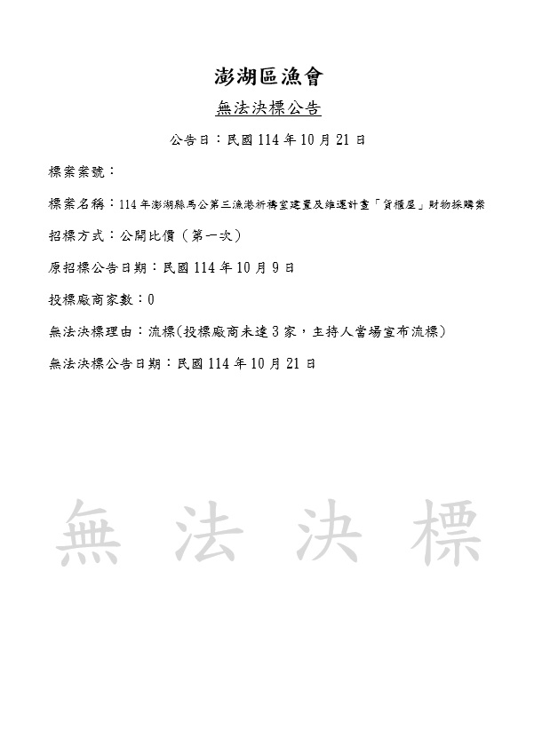 無法決標公告(114年澎湖縣馬公市第三漁港祈禱室建置及維運計畫「貨櫃屋」財物採購案第一次比價)